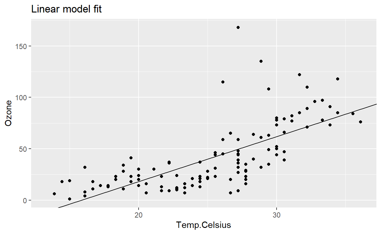 model <- lm(Ozone ~ Temp.Celsius, data = airquality)